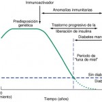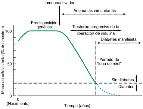 Modelo temporal del desarrollo de la diabetes tipo 1. Los individuos genéticamente predispuestos están expuestos a un inmunoactivador que inicia un proceso autoinmunitario cuya consecuencia es una declinación gradual de la masa de células beta. La pendiente de descenso de la masa de células beta varía de un individuo a otro. Este trastorno progresivo de la liberación de insulina produce diabetes cuando se ha destruido alrededor de 80% de la masa de células beta. Se puede ver una fase de “luna de miel” en el año o los dos años que siguen al inicio de la diabetes, que se acompaña de decremento de las necesidades de insulina.