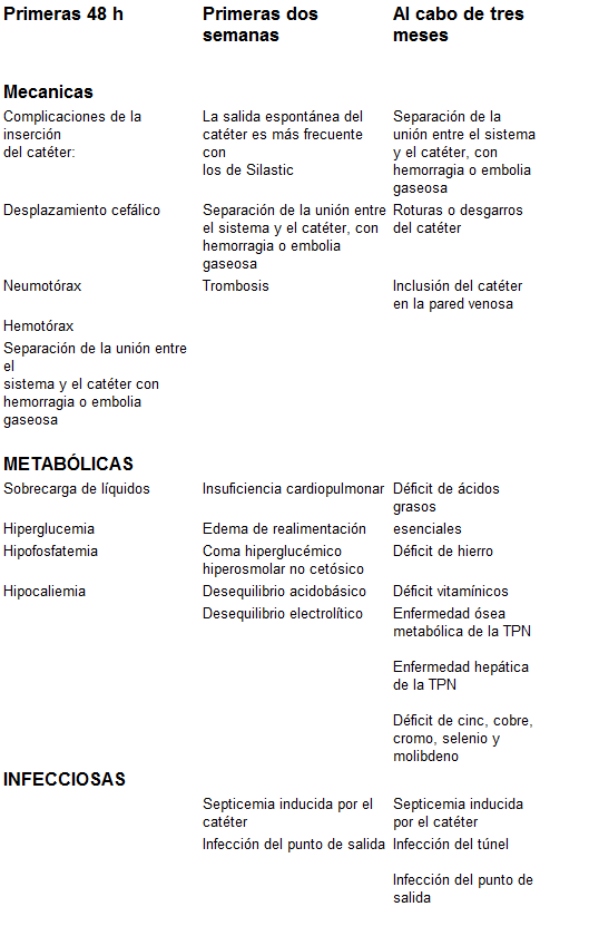 Sólo personal experto y que use una técnica aséptica se encargará de introducir un catéter en una vena central. La posición precisa del tubo se confirmará por un método radiográfico antes de introducir en la vena soluciones hipertónicas de nutrientes. Puede haber trombosis en su interior, en particular si el tubo se utiliza para extraer muestras de sangre, y la extensión de la trombosis hasta la vena central suele coincidir con un cuadro infeccioso. A veces el uso de agentes trombolíticos permite recanalizar los catéteres trombosados, con lo que se recupera el libre tránsito. No hay consenso en cuanto a la conveniencia de agregar 1 000 U/L de heparina a la solución parenteral para evitar la trombosis; ningún estudio comparativo con asignación aleatoria ha demostrado beneficio, mientras que el anticoagulante puede contribuir a la pérdida de mineral óseo, que es ya de por sí un problema con la nutrición parenteral prolongada. Se ha demostrado disminución en la frecuencia de trombosis en el interior del catéter, con dosis pequeñas de warfarina ingerida (1 mg/día), que no alteran el tiempo de protrombina.