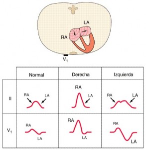 La sobrecarga de la aurícula derecha (aguda o crónica) puede aumentar la amplitud de la onda P ( 2.5 mm). La sobrecarga de la aurícula izquierda normalmente se acompaña de onda P bifásica en V1, con un componente negativo ancho, o bien una onda P generalmente mellada y ancha ( 120 ms) en una o más derivaciones de los miembros. Este patrón también se observa en los retrasos de conducción de la aurícula izquierda cuando no existe una verdadera dilatación, por lo que se habla más bien de anomalía auricular izquierda.