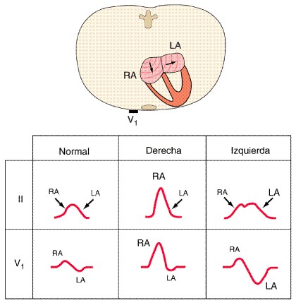 La sobrecarga de la aurícula derecha (right atrial, RA) produce ondas P altas y picudas en las derivaciones de los miembros o en las precordiales. La anomalía auricular izquierda (left atrial, LA) produce ondas P anchas y, a menudo, con muescas en las derivaciones de los miembros, y a onda P bifásica en V1 con un componente negativo importante que indica despolarización tardía de la LA.
