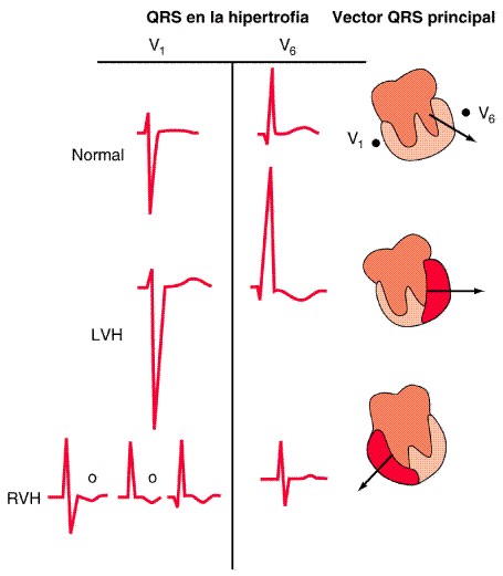 La hipertrofia ventricular izquierda (left ventricular hypertrophy, LVH) aumenta la amplitud de las fuerzas eléctricas que se dirigen hacia el plano izquierdo y posterior. Además, las anomalías de la repolarización producen una depresión del segmento ST y una inversión de la onda T en las derivaciones con una onda R prominente (patrón por “sobrecarga”). La hipertrofia ventricular derecha (right ventricular hypertrophy, RVH) desplaza el vector QRS a la derecha, efecto que suele relacionarse con un complejo R, RS o qR en la derivación V1. Las derivaciones precordiales derechas muestran, a veces, una inversión de la onda T (patrón de “sobrecarga”).