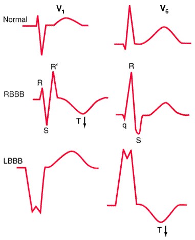 Comparación del patrón QRS-T característico del bloqueo de la rama derecha del haz de His (right bundle branch block, RBBB) y bloqueo de la rama izquierda del haz de His (left bundle branch block, LBBB) en comparación con un trazado normal en las derivaciones V1 y V6. Obsérvese la inversión secundaria de la onda T (flechas) en las derivaciones con complejo rSR’ con RBBB y en las derivaciones con una onda R ancha con bloqueo de la rama izquierda del haz de His.