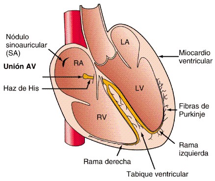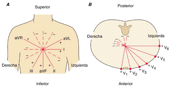 La primera fase de la activación eléctrica del corazón consiste en la expansión de la onda de despolarización a través de las aurículas derecha e izquierda y continúa con la contracción auricular. A continuación, el impulso estimula los marcapasos y los tejidos de conducción especializados en el nódulo auriculoventricular (AV) y en el haz de His; la combinación de estas dos regiones conforma la unión AV. El haz de His se bifurca en dos ramas principales, derecha e izquierda, que transmiten rápidamente la onda de despolarización hacia el miocardio del ventrículo derecho e izquierdo a través de las fibras de Purkinje. La rama izquierda se divide, a su vez, en dos: un fascículo anterior y otro posterior. Los frentes de despolarización se extienden, por último, a través de la pared ventricular, desde el endocardio hacia el epicardio, lo que desencadena la contracción ventricular.Como las ondas de despolarización y repolarización cardíacas tienen una dirección y una magnitud determinadas, se pueden representar con vectores. Los vectocardiogramas que miden y muestran estos potenciales instantáneos ya no se usan en la práctica clínica. Sin embargo, los principios generales del análisis vectorial son esenciales para comprender la génesis de los ECG normales y patológicos. El análisis vectorial ilustra un concepto básico de la electrocardiografía: el ECG registra en la superficie cutánea la compleja suma espacial y temporal de los potenciales eléctricos de múltiples fibras del miocardio. Este principio explica las limitaciones inherentes a la sensibilidad (la actividad de ciertas regiones cardíacas puede quedar enmascarada o carecer de la magnitud suficiente para su registro) y especificidad del ECG (la misma suma vectorial puede ser consecuencia de un aumento o de una pérdida selectiva de fuerzas en direcciones opuestas).