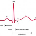 despolarización auricular (fig. 210-2). El complejo QRS representa la despolarización ventricular y el complejo ST-T-U (segmento ST, onda T y onda U), la repolarización ventricular. El punto J es la unión entre el extremo final del complejo QRS y el inicio del segmento ST. La repolarización auricular suele tener una amplitud muy reducida para poder ser detectada, pero se manifiesta en algunas circunstancias, como en la pericarditis aguda o en el infarto auricular.La morfología de QRS-T en el ECG de superficie se corresponde, en general, con las diferentes fases de los potenciales de acción ventriculares registrados simultáneamente en fibras miocárdicas aisladas (registro intracelular) (véase la fig. 213-2). La pendiente de ascenso brusca (fase 0) del potencial de acción corresponde al comienzo de QRS. La meseta (fase 2) representa al segmento ST isoeléctrico y la repolarización activa (fase 3) ocurre con la inscripción de la onda T. Los factores que disminuyen la pendiente de la fase 0 al alterar la corriente de entrada de Na+ (p. ej., hiperpotasiemia o fármacos como quinidina o procainamida) tienden a prolongar la duración del complejo QRS. Los factores que prolongan la fase 2 (amiodarona, hipocalcemia) aumentan el intervalo QT. En cambio, el acortamiento de la repolarización ventricular (fase 2) por acción de la digital o la hipercalcemia, disminuye la duración del segmento ST.