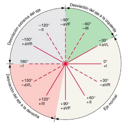 El patrón QRS de las derivaciones de los miembros varía considerablemente de una persona a otra, dependiendo del eje eléctrico de QRS, que describe la orientación media del vector QRS con respecto a las seis derivaciones del plano frontal. Normalmente, el eje QRS oscila entre -30 y +100° (fig. 210- 4). Si el eje es más negativo que -30° se habla de desviación a la izquierda, y si es más positivo que +100°, de desviación a la derecha. La desviación del eje a la izquierda puede representar una variación normal, pero suele esta relacionada con hipertrofia del ventrículo izquierdo, bloqueo del fascículo anterior de la rama izquierda (bloqueo o hemibloqueo fascicular anterior izquierdo) o infarto de miocardio de la cara inferior. La desviación del eje a la derecha también puede suponer una variación normal (sobre todo en los niños y adultos jóvenes) o un falso hallazgo debido a la colocación invertida de los electrodos de los miembros superiores. También se observa en estados de sobrecarga ventricular derecha (aguda o crónica), infarto de la pared lateral del ventrículo izquierdo, dextrocardia, neumotórax izquierdo o bloqueo fascicular posterior izquierdo.