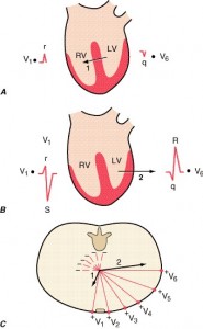 La despolarización ventricular se divide en dos fases fundamentales, que se representan por el vector correspondiente. A. La primera fase (flecha 1) indica la despolarización del tabique ventricular, que comienza por la izquierda y se extiende hacia la derecha. Este proceso se representa por la pequeña onda r “del tabique” de la derivación V1 y la pequeña onda q del tabique de V6. B. La despolarización simultánea de los ventrículos izquierdo (left ventricle, LV) y derecho (right ventricle, RV) constituye la segunda fase. El segundo vector se orienta a la izquierda y hacia atrás, lo que refleja el predominio eléctrico del LV. C. Los vectores (flechas) que representan estas dos fases se ilustran en relación con las derivaciones precordiales.