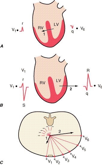 La despolarización normal del ventrículo equivale a una propagación rápida y continua de los frentes de activación. Este complejo proceso se divide en dos grandes fases secuenciales, cada una representada por un vector medio (fig. 210-6). La primera fase consiste en la despolarización del tabique interventricular desde la izquierda a la derecha (vector 1). La segunda obedece a la despolarización simultánea de la masa principal de los ventrículos derecho e izquierdo; normalmente está dominada por el ventrículo de mayor masa, por lo que el vector 2 se dirige a la izquierda y al plano posterior. Por eso, la derivación precordial derecha (V1) registra esta despolarización bifásica en forma de una pequeña deflexión positiva (onda r del tabique) seguida de una gran deflexión negativa (onda S). En cambio, la derivación precordial izquierda V6 registra la misma secuencia con una pequeña deflexión negativa (onda q del tabique) seguida de una deflexión positiva relativamente alta (onda R). Las derivaciones intermedias muestran un aumento relativo de la amplitud de la onda R (propagación normal de la onda R) y una disminución progresiva de la amplitud de la onda S a medida que se avanza en el tórax desde el lado derecho hacia el izquierdo. La derivación precordial en la que las ondas S y R tienen aproximadamente la misma amplitud se conoce como zona de transición (por lo regular V3 o V4).