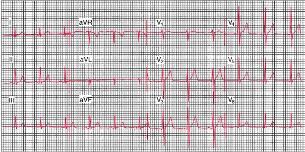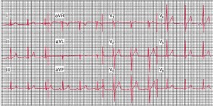 Electrocardiograma normal de una persona sana. Se aprecia un ritmo sinusal con frecuencia cardíaca de 75 latidos por minuto (lpm). El intervalo PR mide 0.16 s; el intervalo QRS (duración), 0.08 s; el intervalo QT, 0.36 s; el eje medio QRS es aproximadamente +70°. Las derivaciones precordiales muestran una propagación normal de la onda R con la zona de transición (onda R = onda S) en la derivación V3.