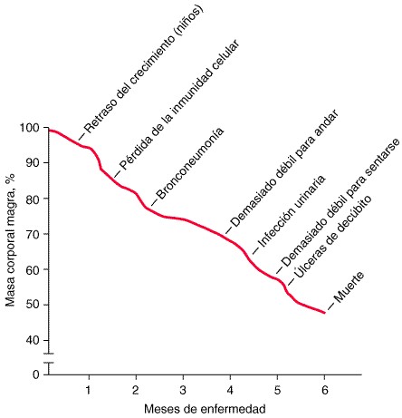 Evolución hipotética de una malnutrición proteinicocalórica en un paciente con una enfermedad consuntiva. (Reproducido con autorización de Heymsfield et al.)