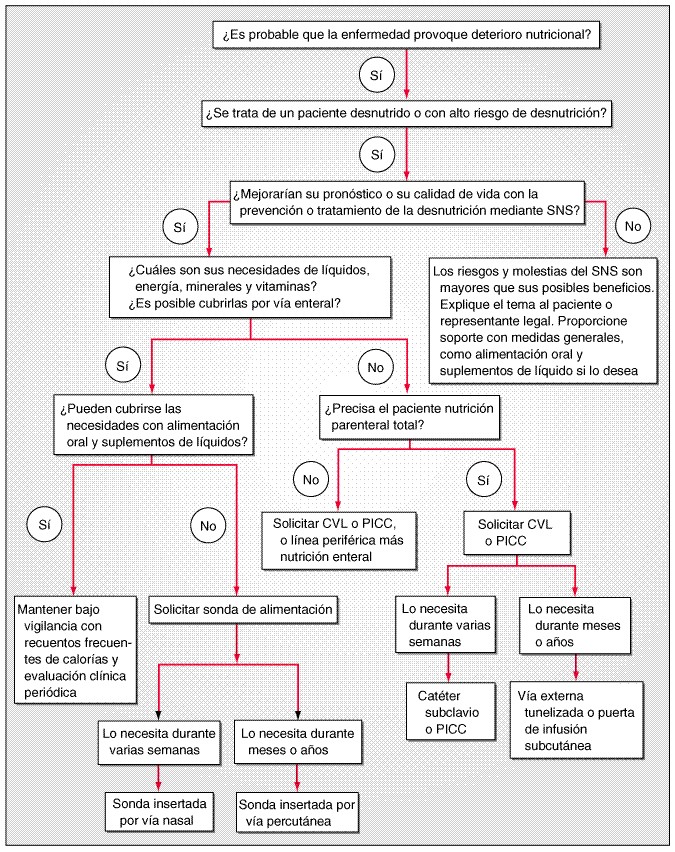 La decisión de emplear el apoyo nutricional especializado de la nutrición (specialized nutrition support, SNS) debe basarse en que existan posibilidades de que la calidad de vida del paciente o la capacidad de recuperación de una enfermedad grave mejore si se evita o corri-ge la malnutrición. Entre 15 y 20% de los pacientes hospitalizados presentan signos de desnutrición. Algunos mejorarán con un apoyo nutricional especializado, aunque para los demás la consunción sea parte inevitable de una enfermedad terminal. La figura 63-1 muestra el algoritmo de los pasos a seguir para decidir si debe aportarse un apoyo nutricional especializado y, en caso de que así sea, de qué manera.
