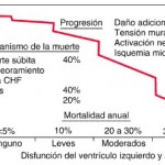 Evolución natural de la insuficiencia cardíaca congestiva (congestive heart failure, CHF). Una vez que se establece la disfunción sistólica del ventrículo izquierdo, suele progresar, aunque de forma imprevisible. A medida que avanza la disfunción ventricular izquierda y aumentan los síntomas, se eleva la tasa de mortalidad y el proceso se torna inexorable. La destrucción de los miocitos y la fibrosis se vuelven irreversibles. Por ello, hay que aplicar una medida preventiva eficaz antes del comienzo o en las primeras fases de la disfunción ventricular izquierda. (De BM Massie, NH Shah:) Curr Opin Cardiol 11:221, 1996; con autorización.