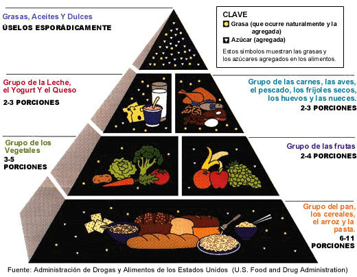 alimentarios o los cuestionarios sobre la frecuencia de los alimentos. Una guía alimentaria muy utilizada para las personas sanas es la pirámide de alimentos del USDA, que resulta útil como base para la identificación de las ingestas deficientes de nutrientes esenciales, así como para detectar los posibles excesos de grasa, de grasa saturada, de sodio, de azúcar y de alcohol . La guía se ajusta según varíe el número de raciones para cubrir las necesidades de personas de diferentes edades y en distintas fases del ciclo de vida; los individuos que respetan costumbres étnicas en su alimentación o que siguen esquemas poco comunes quizá necesiten orientación adicional sobre la forma de clasificar los alimentos y sobre las raciones que constituyen una ración apropiada. Al revisar la guía con la persona se le ayuda a establecer una transición hacia un esquema alimentario más sano y a identificar grupos de alimentos que se consumen en cantidades superiores a las recomendadas o que, por lo contrario, no son suficientes. En cuanto a los que reciben dietas terapéuticas, puede resultar útil hacer una valoración comparada utilizando las listas de intercambio de alimentos. Entre éstas se encuentran, por ejemplo, la lista de intercambio para la diabetes de la American Diabetes Association o las listas para intercambio de alimentos para enfermos renales de la American Dietetic Association.Evaluación del estado nutricional