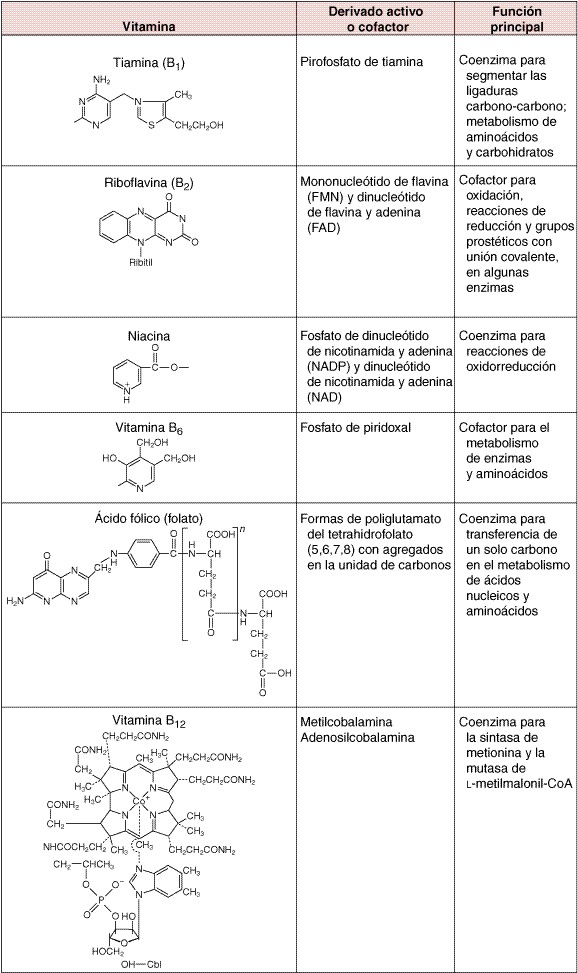 La tiamina fue la primera vitamina B identificada, por lo que recibió el nombre de B1. La tiamina interviene en la descarboxilación de los -cetoácidos, como el piruvato, el -cetoglutarato, y en la de los amino-ácidos ramificados y es, por tanto, una fuente de energía. Además, el pirofosfato de tiamina actúa como coenzima en la reacción de la transcetolasa que interviene en la conversión de las hexosas y las pentosas fosfato. Se ha propuesto asimismo que la tiamina interviene en la con-ducción nerviosa periférica, aunque se desconocen las reacciones exactas en las que se basaría esta función.